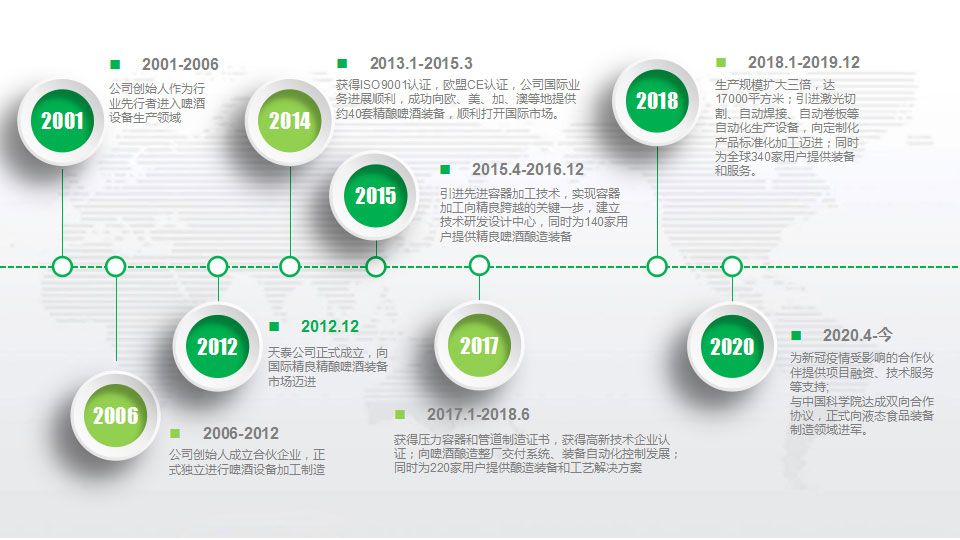 公司團(tuán)隊始于2001年,至今有19年的行業(yè)經(jīng)驗,也見證了行業(yè)的飛速發(fā)展。公司成立于2012年,之后便是精釀啤酒市場的蓬勃發(fā)展時期,我們一致力于精釀啤酒項目工藝多樣化、裝備定制化、操控自動化、管理數(shù)據(jù)化的研發(fā)和積累。到目前,天泰公司己向全球76個國家和地區(qū)超過1300家啤酒廠提供全套的設(shè)備及工藝解決方案,并取得良好口碑。2020年山東天泰與中國科學(xué)院微生物研究所簽訂技術(shù)合作協(xié)議,雙方共建“中科天泰液態(tài)酒聯(lián)合創(chuàng)新研發(fā)中心“。